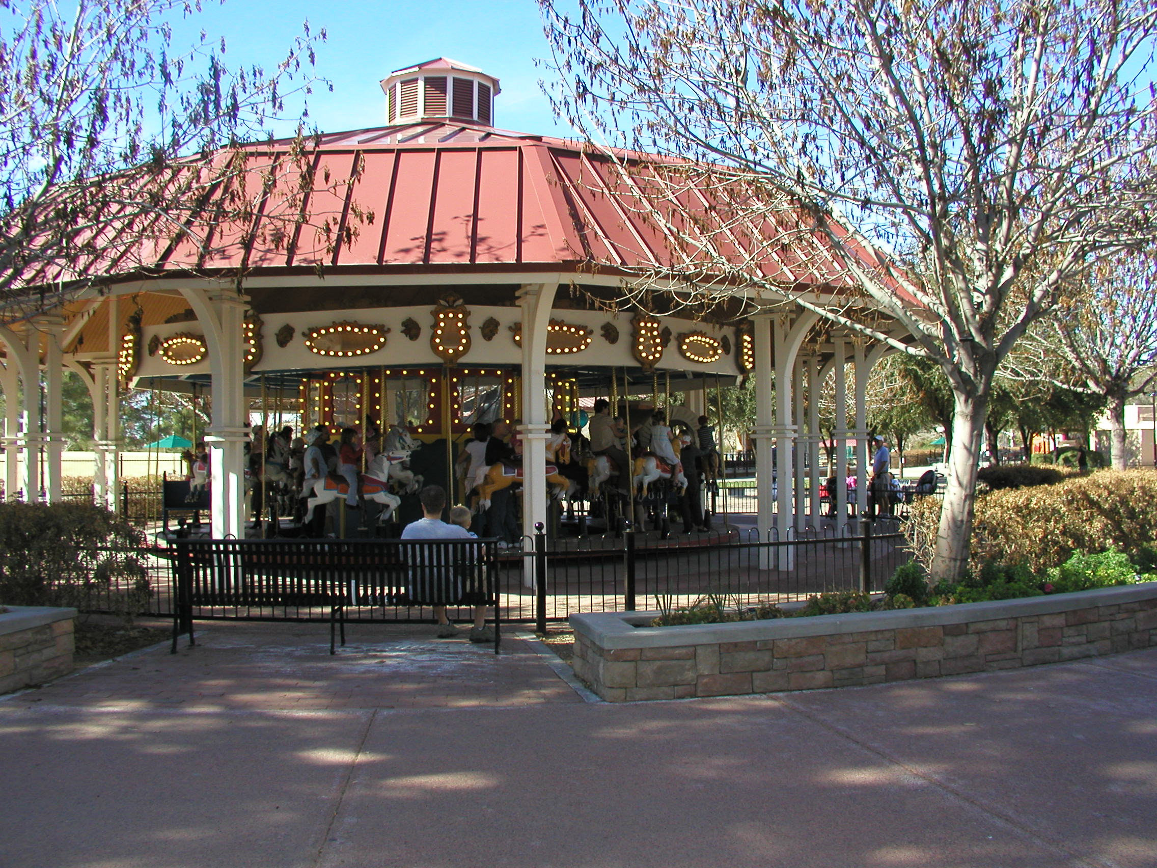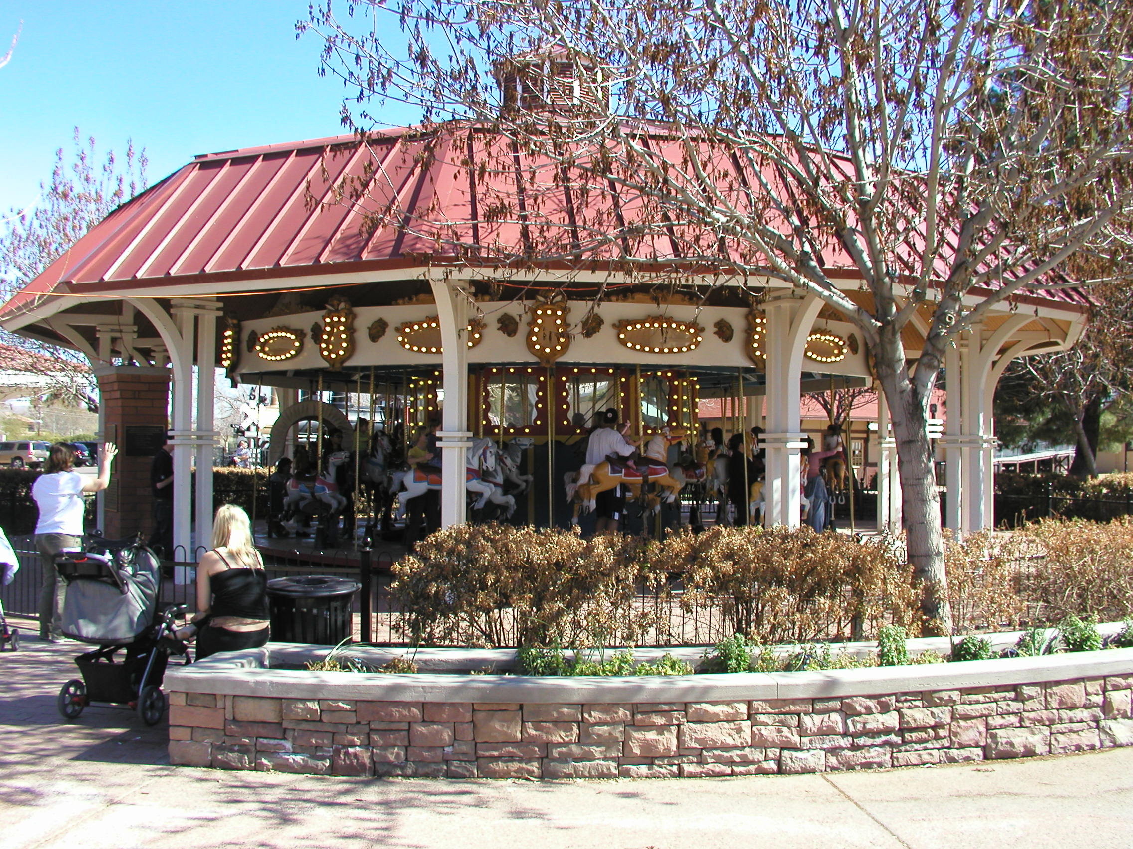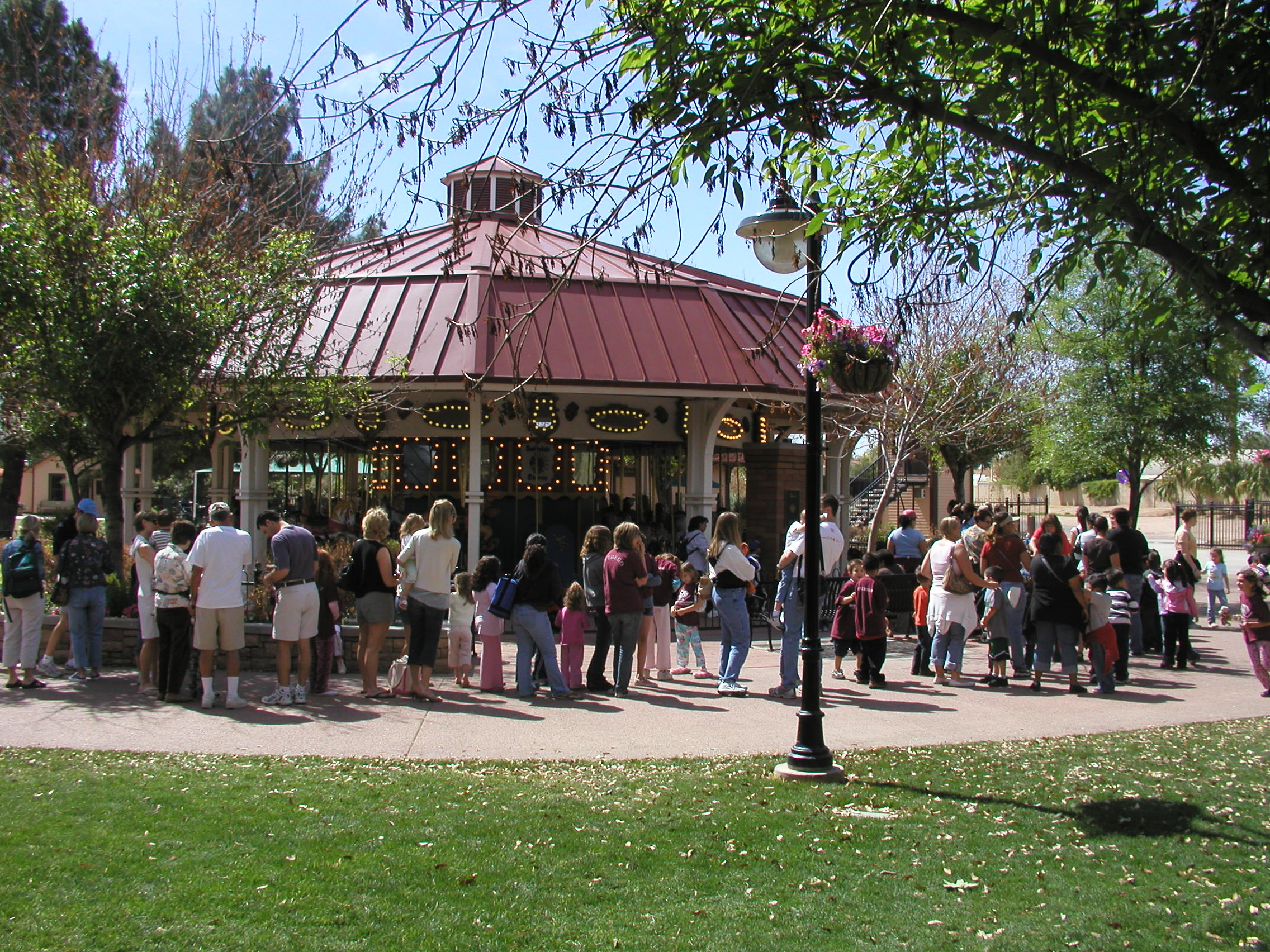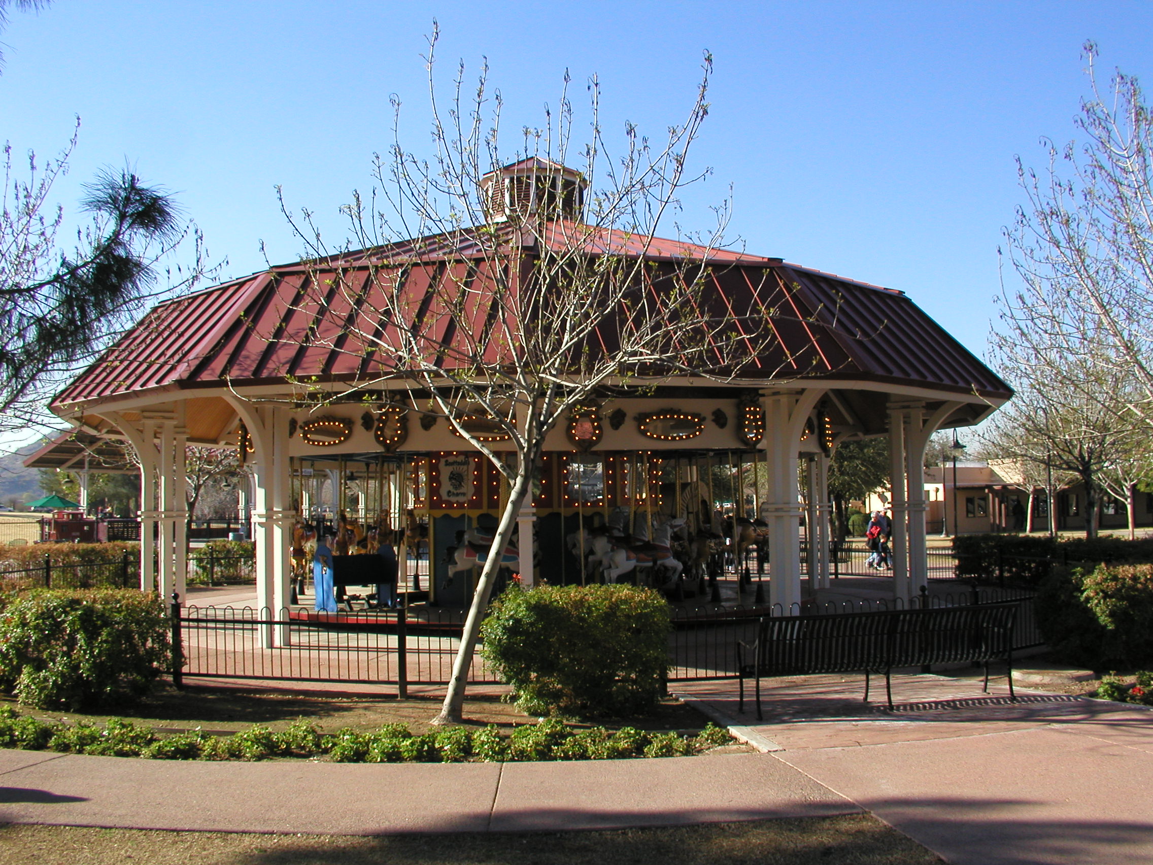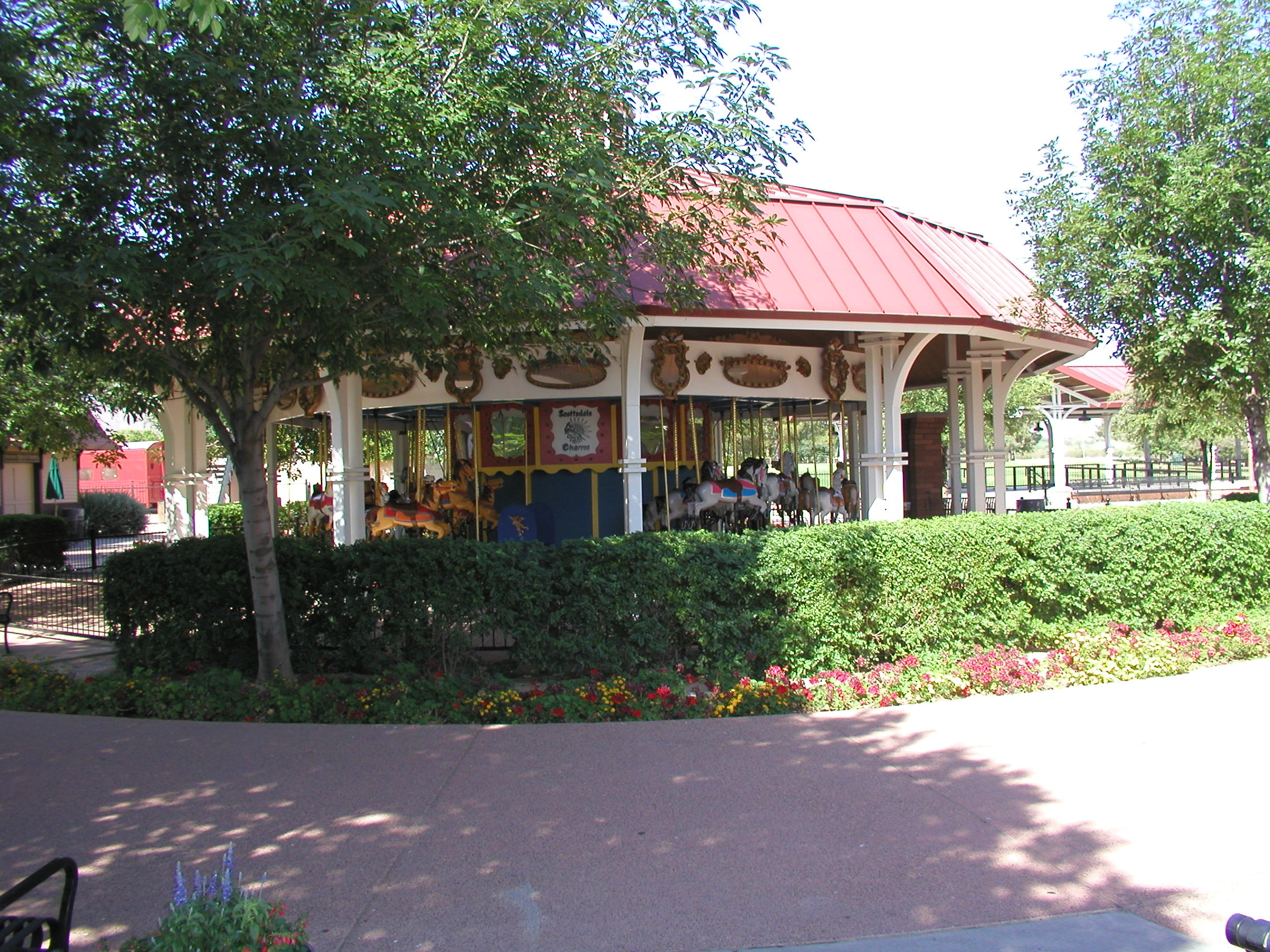 It had spent many years at Benson’s Wild Animal Park in Hudson, New Hampshire, a few years at a New Hampshire race track, and then was trucked across the country and restored for the railroad park by Brass Ring Entertainment/Dan Horenberger principal. According to Horenberger, he had to “pack” the carousel horses with special materials so that they would not be too hot to sit on during Scottsdale’s summer heat. The Scottsdale Charros and the Scottsdale Railroad and Mechanical Society funded the purchase, relocation and restoration of the carousel, which became a park-operated attraction (as opposed to a privately-operated concession as the previous carousel had been).