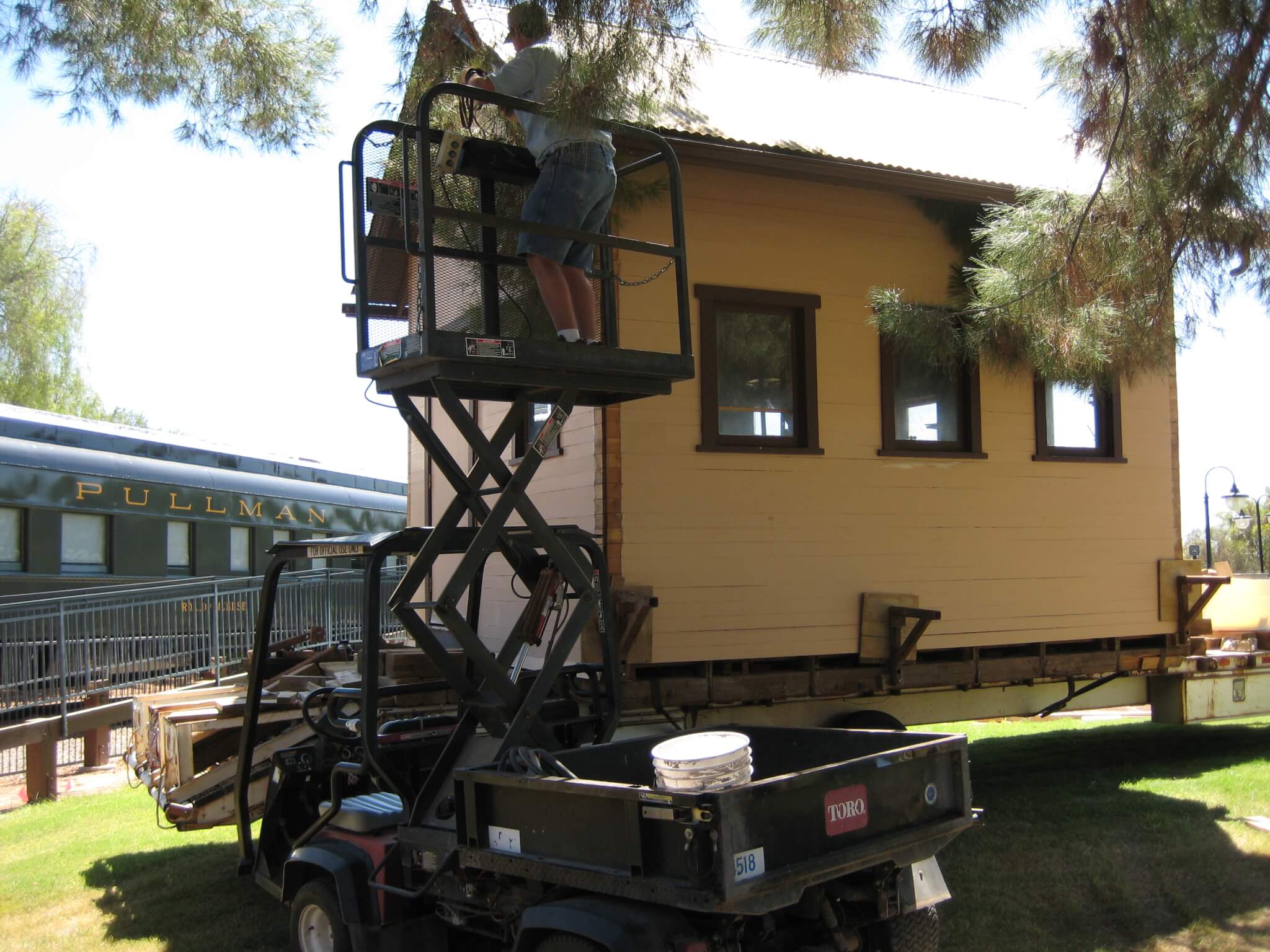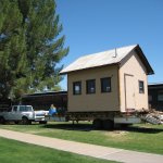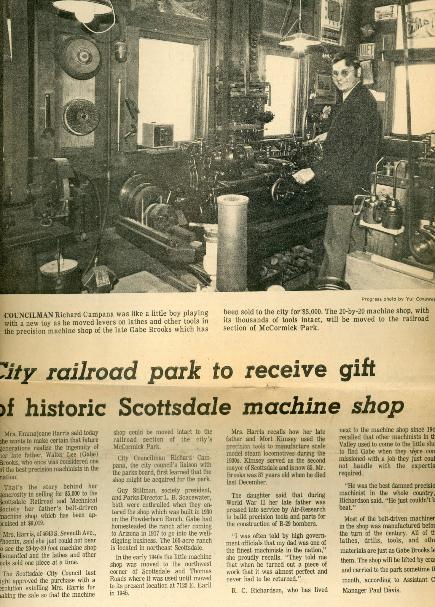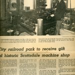 Gabe Brooks’ machine shop was acquired by the City of Scottsdale from Brooks’ daughter, Emmajeane Brooks Harris of Phoenix, at a cost of $5,000. The shop was moved from Earll Drive in downtown Scottsdale to the park in December, 1973. Brooks built the 20-foot by 20-foot shop circa 1930 on Powderhorn Ranch, the land he homesteaded in 1917 that is northeast of what was then unincorporated Scottsdale. He later moved the shop into the downtown area, first to Scottsdale and Thomas Road, then to 7125 E. Earll in 1945. The shop was considered state-of-the-art for its time and Brooks was considered a master precision machinist. Brooks was also known for his prowess as a water well digger throughout the Scottsdale area during the 1930s and 1940s and he used the shop’s equipment in his drilling business.